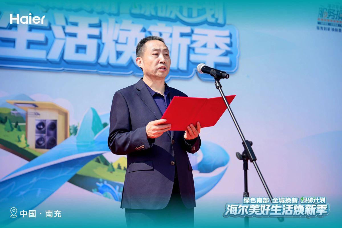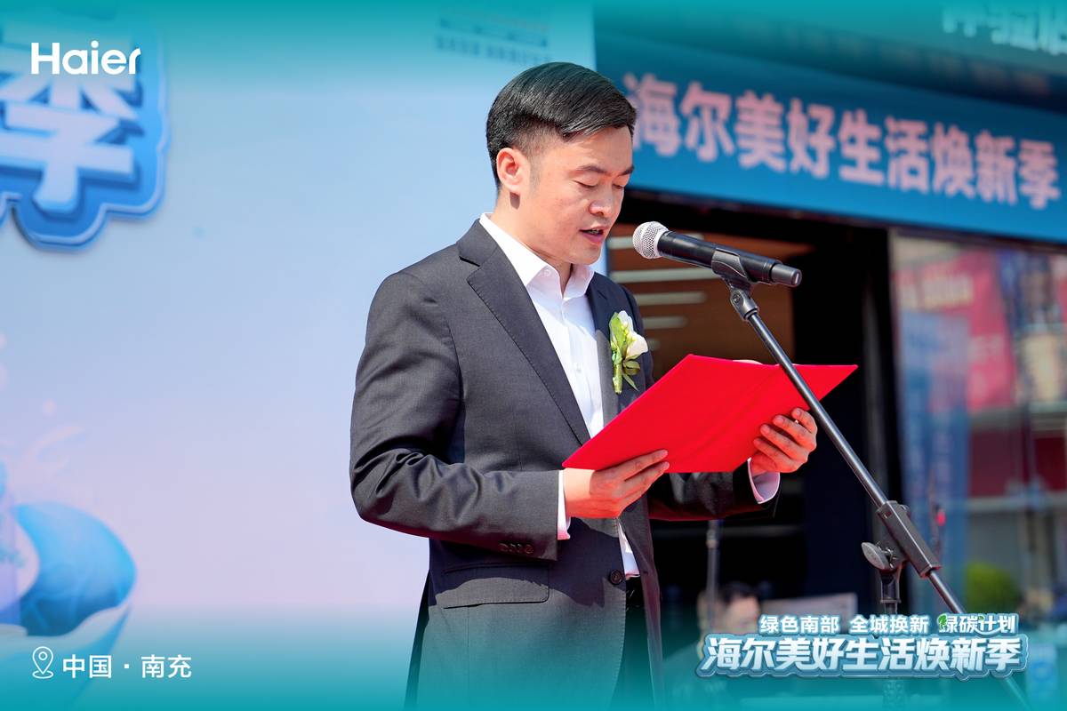 现场,海尔智家四川分公司副总经理营销总经理张林在会上介绍海尔智家四川分公司推出的“绿色南部,全城换新”战略。作为家电行业龙头企业,海尔智家积极响应国家政策,践行社会责任,不仅为用户带来便捷、高效、省心的回收服务,还积极推动废旧家电集中有序回收,科学拆解,提高资源利用率,助力绿色低碳可持续发展。