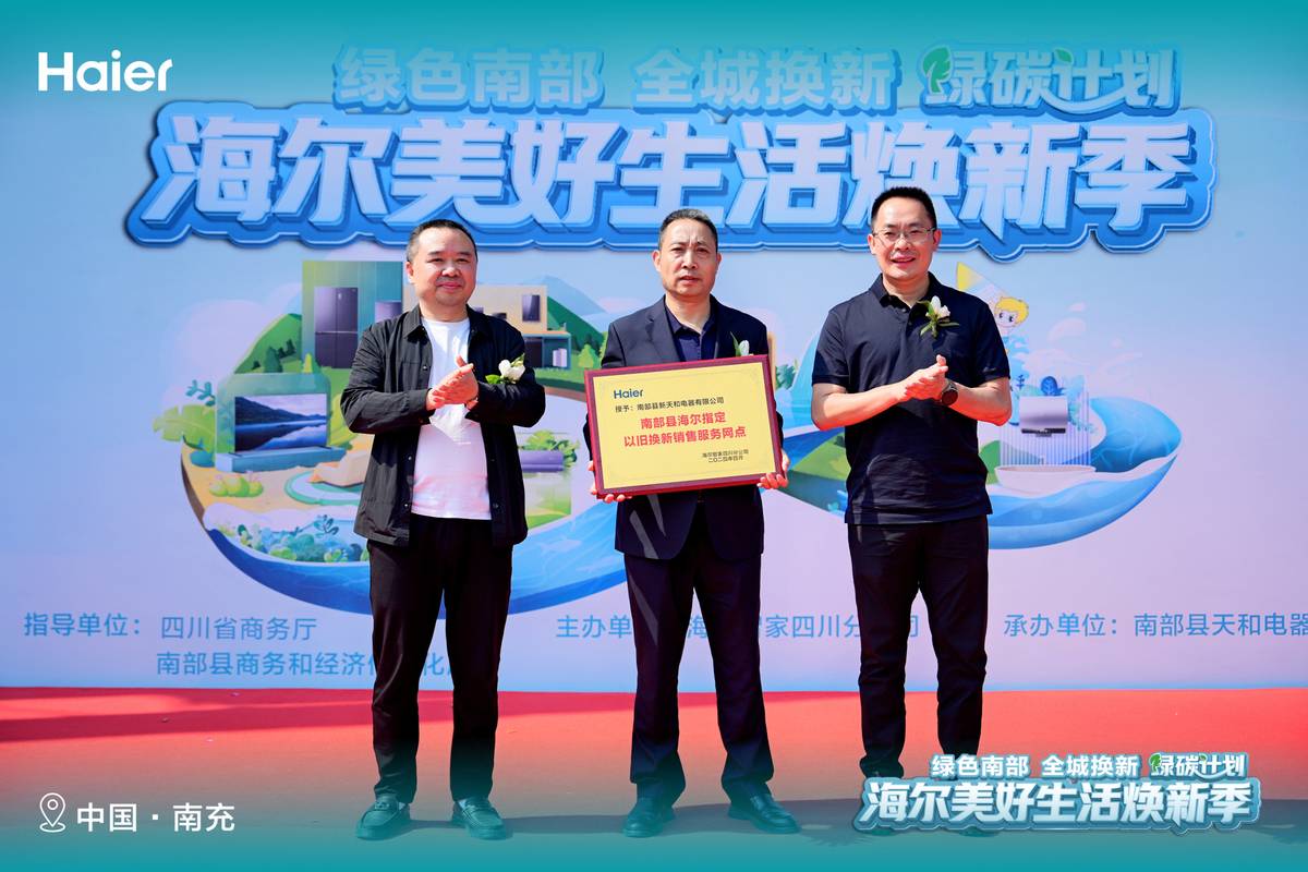 会上,南部县商务和经济信息化局相关领导、海尔集团川藏大区首席代表/海尔智家四川分公司总经理肖隆彬一起为南部县新天和电器有限公司和南部县海尔指定以旧换新销售服务网点进行授牌,将它们正式确定为海尔智家四川分公司“绿色南部,全城换新”战略的示范点。随后海尔智家四川分公司副总经理营销总经理张林为南部县海尔指定以旧换新销售服务网点进行授牌。服务网点的落成也将引领更多的企业和市民加入环境保护的行动中来。