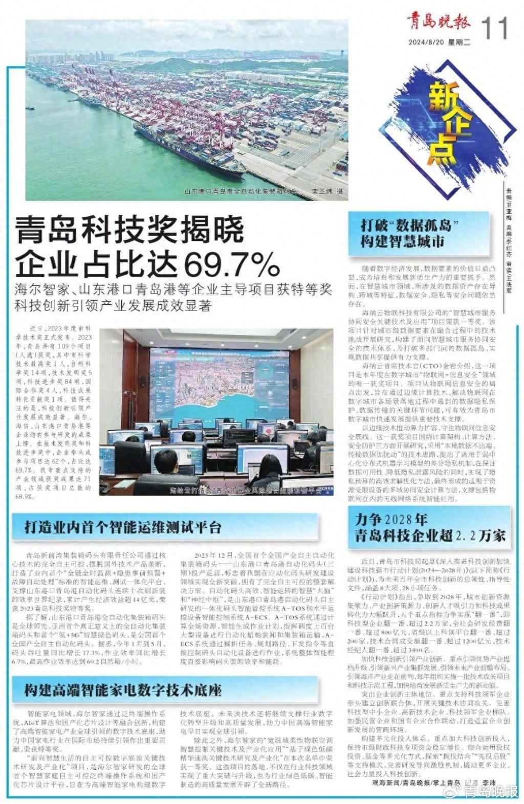 近日,2023年度市科学技术奖正式发布。2023年,青岛共有109个项目(人选)获奖,其中市科学技术最高奖1人,自然科学奖14项,技术发明奖5项,科技进步奖84项,国际合作奖4人,科技成果转化贡献奖1项。值得关注的是,科技创新引领产业发展成效显著。海尔、海信、山东港口青岛港等企业均有参与研发的成果上榜。在技术发明奖和科技进步奖中,企业牵头或参与项目达62个,占比达69.7%。我市重点支持的产业领域获奖成果达71项,占获奖项目总数的68.9%。