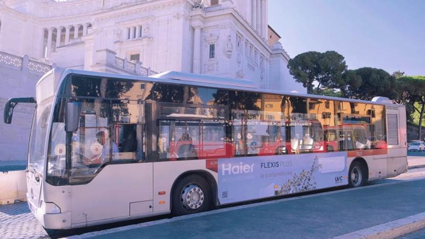 印有海尔LOGO的大巴车行驶在意大利威尼斯广场