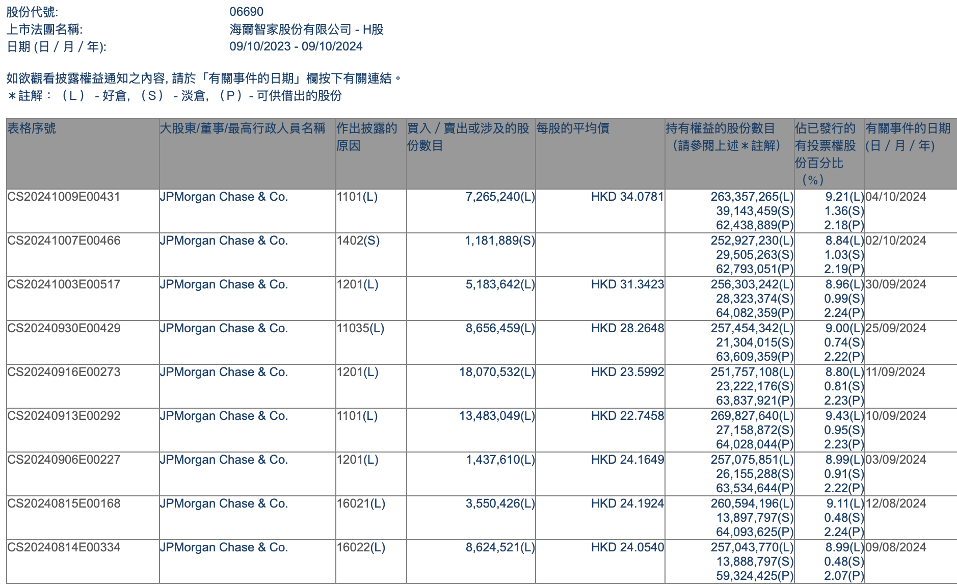 9月以来,摩根大通对海尔智家H股已经进行了多次买卖。根据披露易数据显示,摩根大通在9月3日以24.1649港元的每股均价卖出约143.8万股,并于9月10日以22.7458港元的均价买进134.8万股,9月11日再以23.5992港元的均价卖出180.7万股。国庆节前,其于9月25日以28.2648港元的均价买进865.6万股,9月30日又以31.3423港元的均价卖出518.3万股。