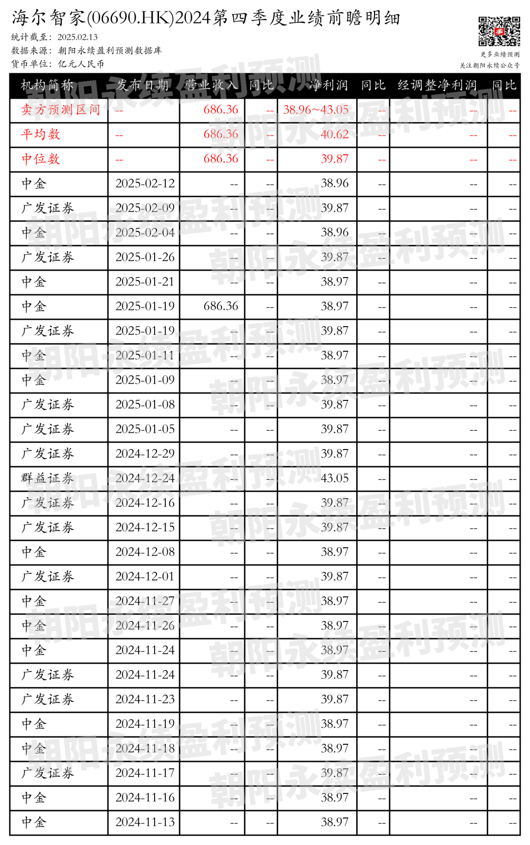 截至2025年02月13日,根据朝阳永续季度业绩前瞻数据: