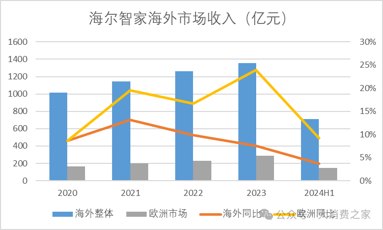 2021年至2023年,海尔在欧洲实行高端化转型战略,洗衣机、冰箱、洗碗机等新品显现出节能、嵌入式、大屏化、智能化的特点,并加快了供应链本土化布局。因此这三年海尔在欧洲的平均收入增速达20%,远超海外其他区域收入。到了2024年上半年,欧洲市场占海外整体收入的比例已超过20.5%,相较2020年提升了4个百分点。