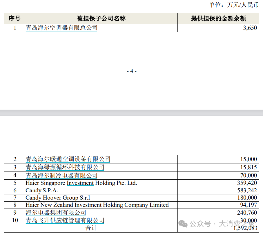 按照2024年12月31日的外汇汇率折算,海尔智家及其子公司对其他子公司的担保总余额为159.2亿元,占公司最近一期经审计净资产的15.4%。其中,担保额最高的就是两家欧洲品牌公司Candy和Hoover,合计担保余额达76.8亿元,占总余额的48%。