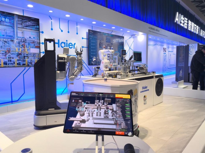 其实,除了这些AI科技,海尔智家还将幕后的AI智造生产线搬到了AWE2025现场,这在行业尚属首例。据介绍,这条“具身智能生产线”融合了数字孪生、AI大模型、人形机器人及智慧物流调度等前沿技术,是一条完全无人化、全智能生产线,拥有自主进化的“智慧大脑”,可以实现云端到终端的全链路调度与协同。这也是家电行业首次将人形智能机器人应用于智能制造过程中,通过具身智能算法实现人机交互及柔性复杂场景操作。此外,作为一条绿色制造生产线,通过碳足迹跟踪、碳中和,该生产线可实现低碳甚至无碳生产。