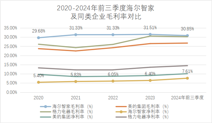 2020-2024年前三季度,海尔智家一直将毛利率保持在30%左右的高水平。