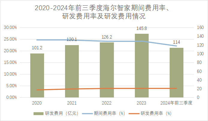 这种低净利现象,主要是期间费用率高造成的。2024年前三季度,海尔智家的期间费用率为22.09%,远超格力电器(12.33%)、美的集团(15.66%)。