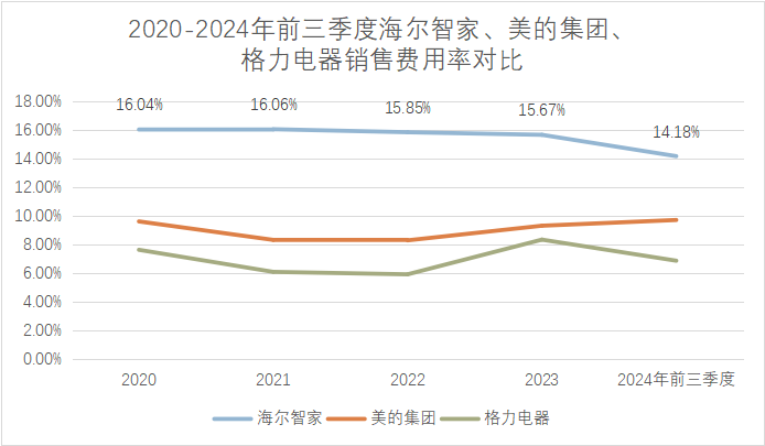 近年来,海尔智家的销售费用率处于14%以上,甚至在2021年一度达到16.06%。而美的集团和格力电器基本保持在低于10%的水平。