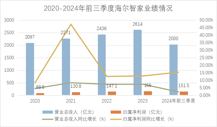 2024年前三季度,海尔智家在收入同比微增2.17%到2030亿元的同时,净利润再次大增15.27%达到151.5亿元,保持着良好的发展势头。