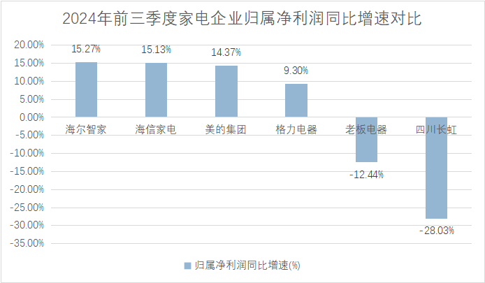 2024年前三季度,海信家电、美的集团的净利润分别同比增长15.13%、14.37%,较海尔智家略有不及;格力电器以9.30%明显落后;老板电器、四川长虹等企业净利润更是负增长。