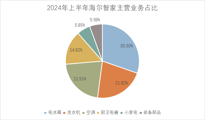 2024年上半年,电冰箱、洗衣机、空调占海尔智家业务营收比例的前三名,分别为30.30%、21.82%、21.51%,分布较为均衡。