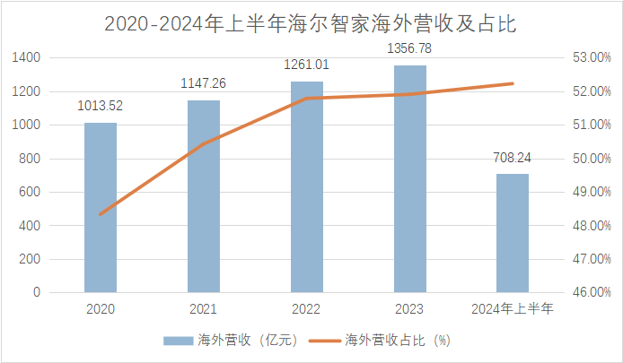 2020-2024年上半年,海尔智家的海外营收及占比连年攀升。2024上半年,公司的海外营收实现708.24亿元,占比更是高达52.22%,成为国内唯一一家海外占比过半的家电企业。