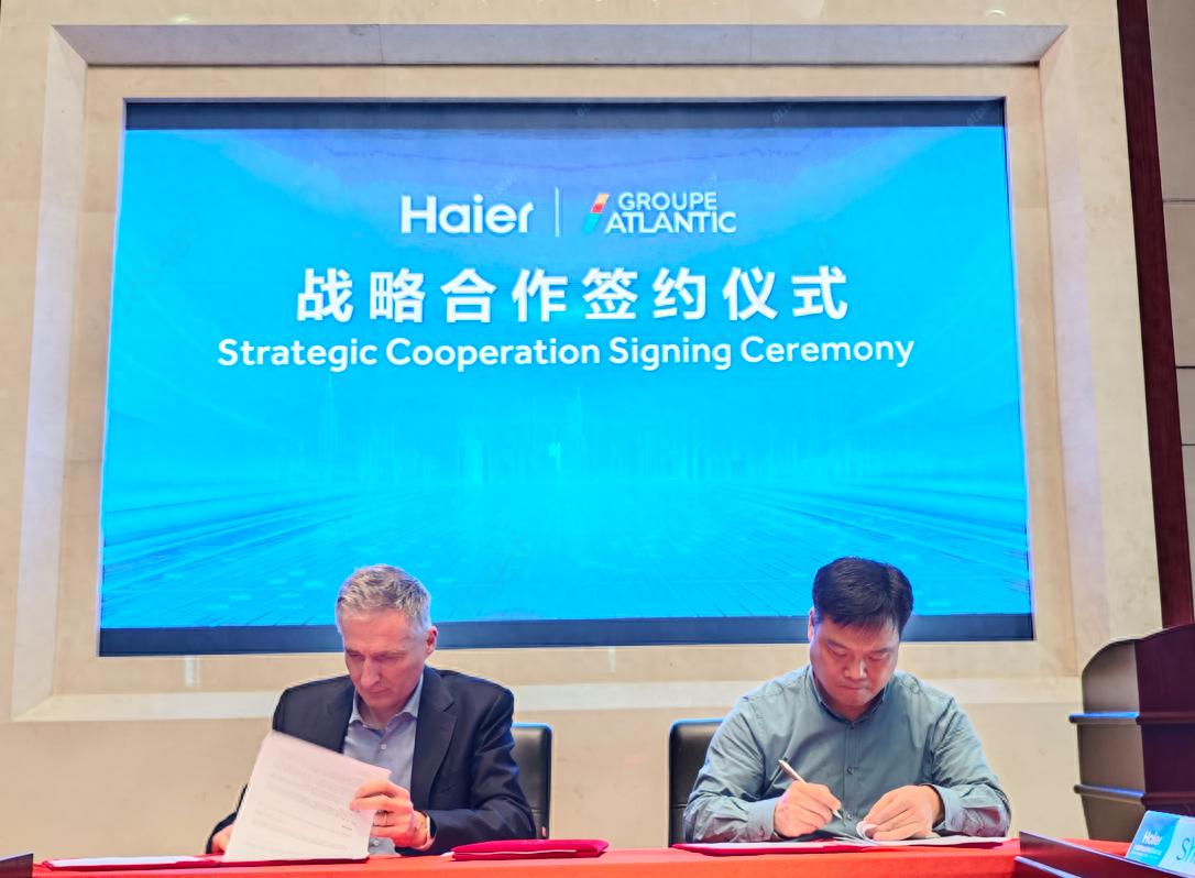 7月18日,海尔智家与法国大西洋集团正式签署合作协议。双方将携手开展空气能热泵的研发工作,并推动绿色建筑高效、舒适、智慧解决方案的落地。