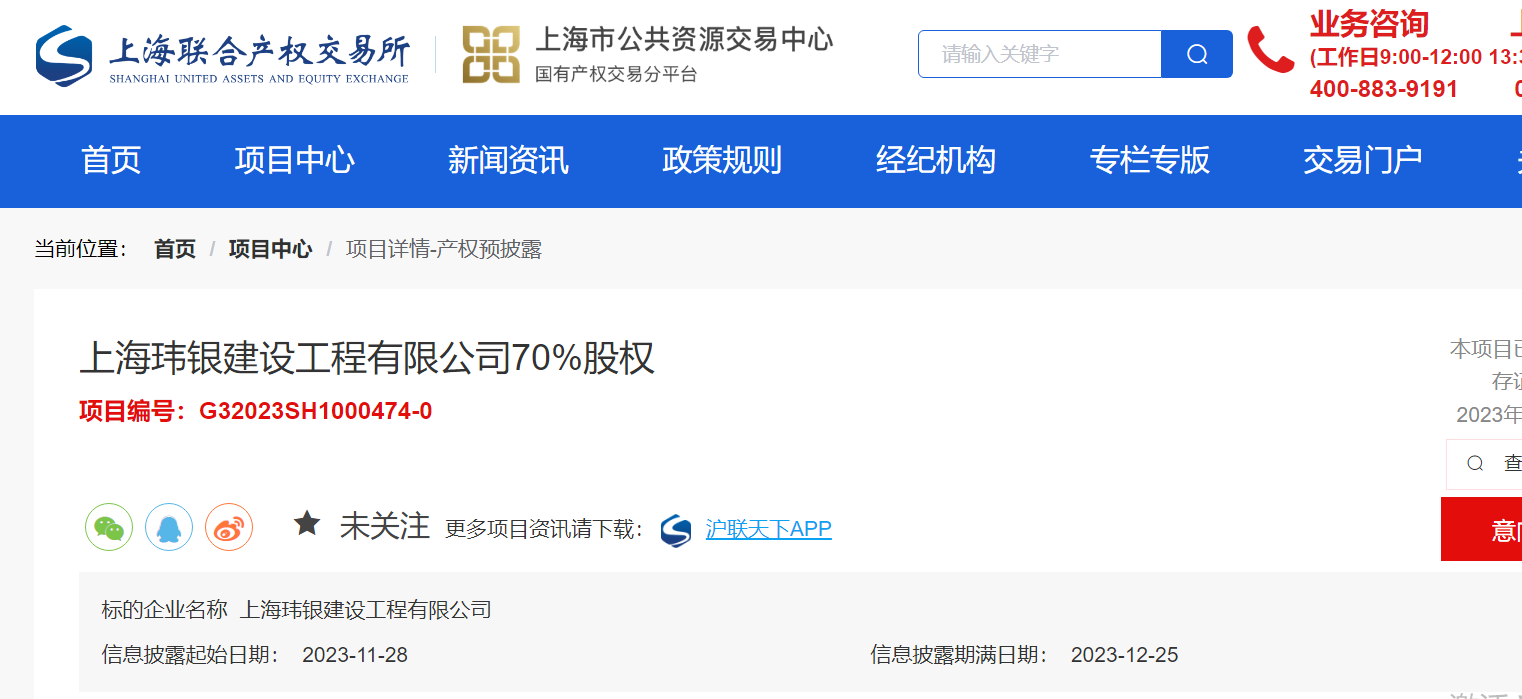 12月6日,据上海联合产权交易所,上海玮银建设工程有限公司(以下简称“玮银建设”)70%股权拟挂牌转让,转让方为上海亚通股份有限公司。