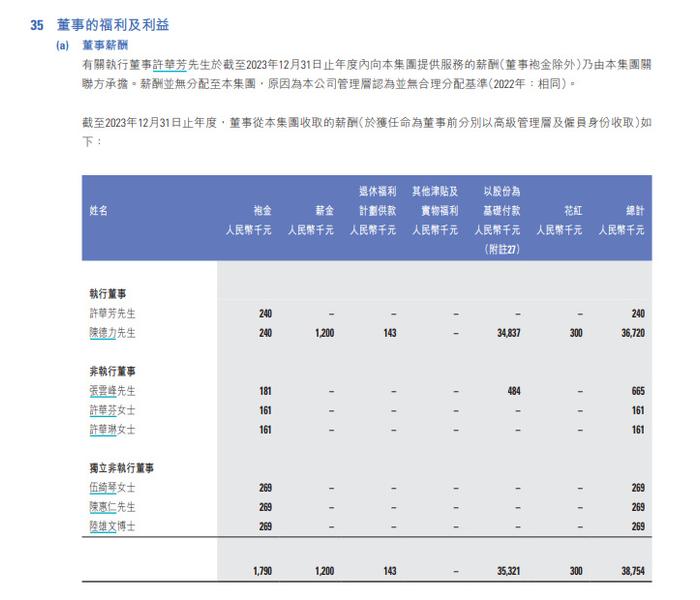 不过,陈德力的高薪主要来自股份支付而非现金。仅以2023年为例,陈德力3672万元的薪水中,有3483.7万元是以股份的方式支付的,占比达到了94.9%。