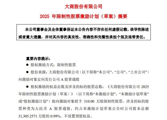 股权激励授予要求为,2025年和2026年大商股份归属于上市公司股东的扣除非经常性损益的净利润比上一年增长不低于10%,其中净利润是指扣非净利润,且剔除激励计划所涉及的股份支付费用影响等之后计算得出。