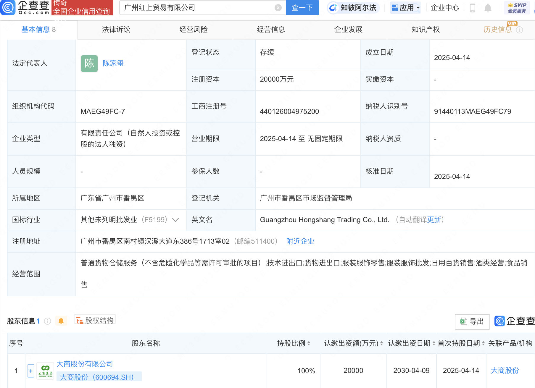 近日,广州红上贸易有限公司成立,法定代表人为陈家玺,注册资本2亿元,经营范围包含:服装服饰零售;服装服饰批发;日用百货销售;酒类经营等。股权穿透显示,该公司由大商股份(600694)全资持股。