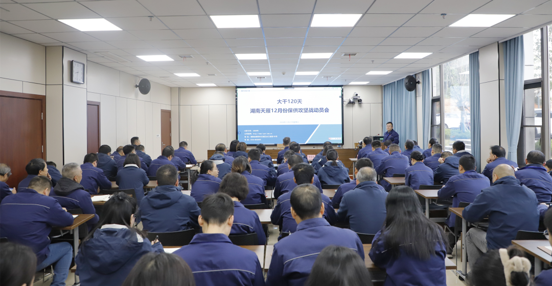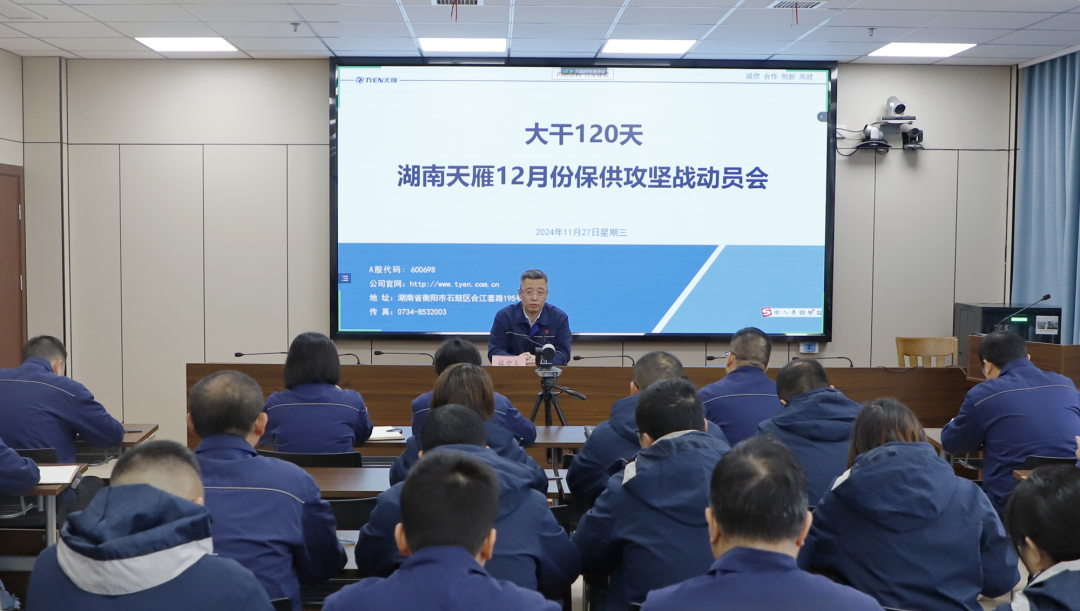 11月27日,湖南天雁召开12月份保供攻坚战动员会,分析12月销售形势,发布保供攻坚战实施方案,吹响了“冲刺12月、打好收官战”号角。党委书记、董事长杨宝全作动员讲话,主管生产副总经理杨国旗主持会议,公司领导、全体L11级以上核心骨干参加会议。