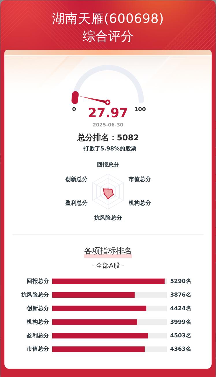 金融界上市公司研究院构建了一套上市公司韧性评价体系,从企业盈利、科技创新、股东回报、经营抗风险、市值表现及机构吸引力六个维度对企业进行量化评分,满分为100分。湖南天雁的韧性评价总分为27.97分,在A股5405家可比上市公司中排名第5082位。