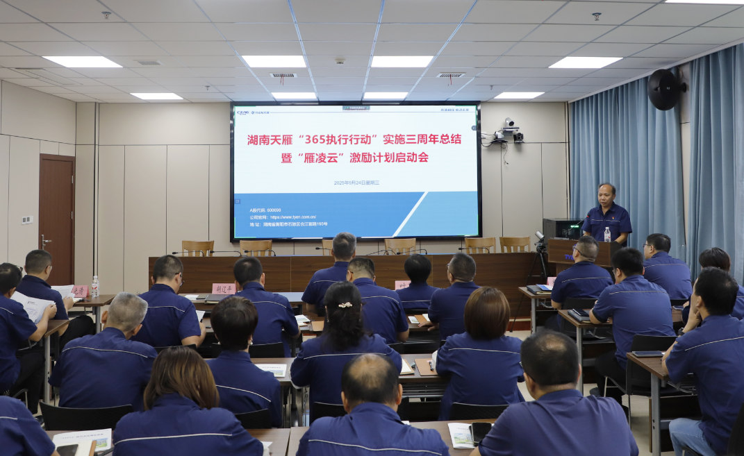 湖南天雁召开“365执行行动”实施三周年总结暨“雁凌云”激励计划启动会。总结“TY612”执行文化推进成果,发布新版执行文化理念体系,启动“雁凌云”激励计划,部署下阶段执行文化建设重点任务。