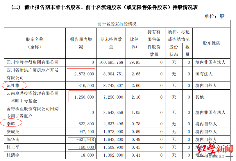 舍得酒业半年报十大股东数据显示,第二大股东四川省射洪广厦房地产开发有限公司一季度末持股1177.78万股,二季度末持股数为890.48万股,较一季度末减持了287.3万股,持股比例从3.50%下降至2.65%;一季度末位列第五大股东的四川省射洪顺发贸易公司,持有舍得酒业401.83万股,但二季度末已经退出了前十大股东行列。