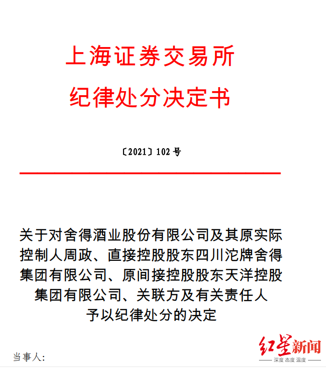 8月18日,记者注意到,上交所官网发布纪律处分决定书,经查明,舍得酒业股份有限公司及其原实际控制人周政、直接控股股东四川沱牌舍得集团有限公司、原间接控股股东天洋控股集团有限公司及关联方四川省蓬溪县蓬山酒业有限公司、三河玉液商贸有限公司、三河天洋城房地产开发有限公司、天洋房地产(三河)有限公司,在信息披露、规范运作方面,有关责任人在职责履行方面,存在违规行为。