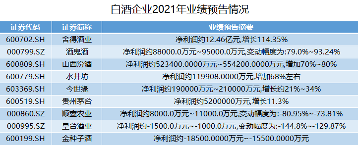 白酒板块不是所有企业均取得了正增长。顺鑫农业(000860.SZ)预计净利润0.80亿元至1.10亿元,同比降幅超过70%;皇台酒业(000995.SZ)预计亏损1000万元至亏损1500万元;金种子酒(600199.SH)预计亏损1.55亿元至亏损1.85亿元。