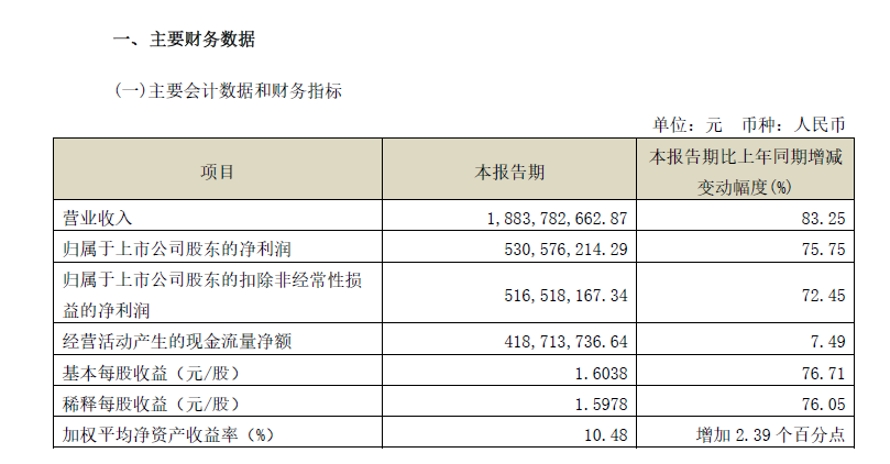 舍得酒业一季报显示,公司1~3月实现营收18.84亿元,同比增长83.25%;归母净利5.31亿元,同比增长75.75%;扣非归母净利5.17亿元,同比增长72.45%。公司表示,业绩大幅上涨主要是公司持续推进老酒战略,老酒品质进一步得到认可。