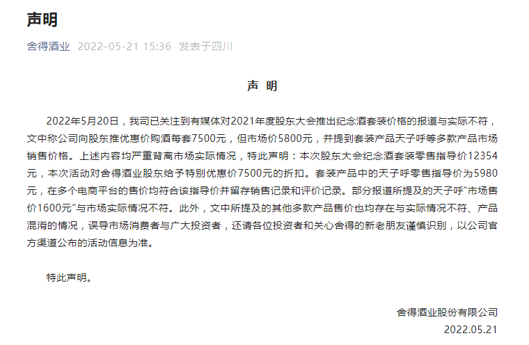 5月21日,舍得酒业官方发布声明称,我司已关注到有媒体对2021年度股东大会推出纪念酒套装价格的报道与实际不符,文中称公司向股东推优惠价购酒每套7500元,但市场价5800元,并提到套装产品天子呼等多款产品市场销售价格,上述内容均严重背离市场实际情况。