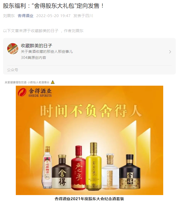 此前20日,舍得酒业官方发布《股东福利:“舍得股东大礼包”定向发售!》一文指出,为答谢投资者的支持,自5月7日至5月26日下午18时,舍得酒业将开展面向持股投资人的优惠购酒活动。