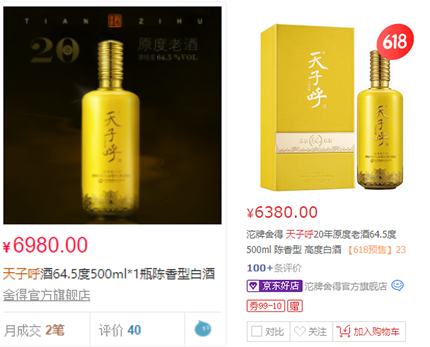 查询发现,64.5度万寿无疆天子呼在天猫、京东舍得官方旗舰店的标价分别为6980元、6380元,在天猫月成交2笔,累计评价40条;在京东累计评价100+条,2022年以来没有相关评论。