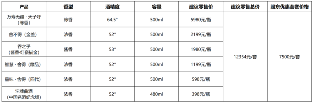 据短平快解读了解,舍得酒业本次推出的“舍得股东大礼包”含6款产品,含64.5度万寿无疆天子呼(陈香)5980元/500毫升、52度舍不得(金盖)2199元/500毫升、53度吞之乎(酱香红瓷描金)1980元/500毫升、52度智慧舍得(藏品)1199元/500毫升、52度品味舍得(四代)598元/500毫升、52度沱牌曲酒(中国名酒纪念版)398元/480毫升,6款产品合计12354元,纪念套装7500元的销售价格大约为这6款产品的零售指导价之和的6折。