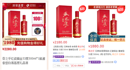53度吞之乎在舍得天猫官方旗舰店的价格为1980元,月销1笔,而在京东沱牌舍得官方旗舰店,同款产品的价格为2180元,第三方售价为1880元。