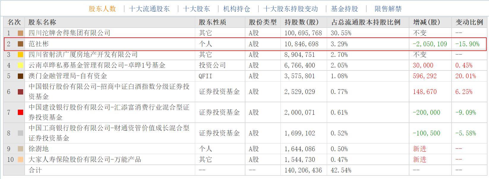 (舍得酒业前十大股东持股变化,截图自东方财富网)