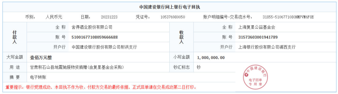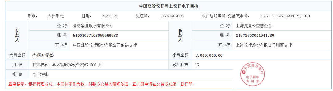 甘肃灾情牵动着全国同胞的心。12月23日,公司决定通过上海复星公益基金会向积石山县地震灾区捐赠300万元现金和100万元物资,捐款及物资将用于支持积石山县的抗震救灾及灾后重建工作。