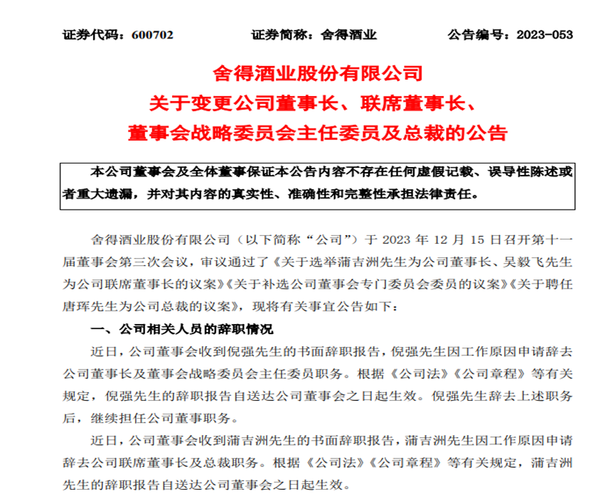 12月15日,舍得酒业发布高管调整等相关事项公告,倪强卸任董事长及董事会战略委员会主任委员职务,继续担任董事职务;蒲吉洲将担任董事长及董事会战略委员会主任委员,负责公司全面治理工作;吴毅飞任联席董事长,唐珲任总裁。
