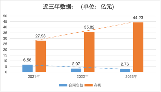2021年经营净现金流约22.28亿元,但2022年这一数据几乎腰斩,2023年下降至7.15亿元。从数据来看,虽然去年有所下降,但下降的幅度相比以前有所减少。年报中披露的原因主要是支付采购货款、广告宣传及市场开发费用增加所致。在此,懂酒哥从合同负债以及存货角度观察下经营净现金流下降的原因。