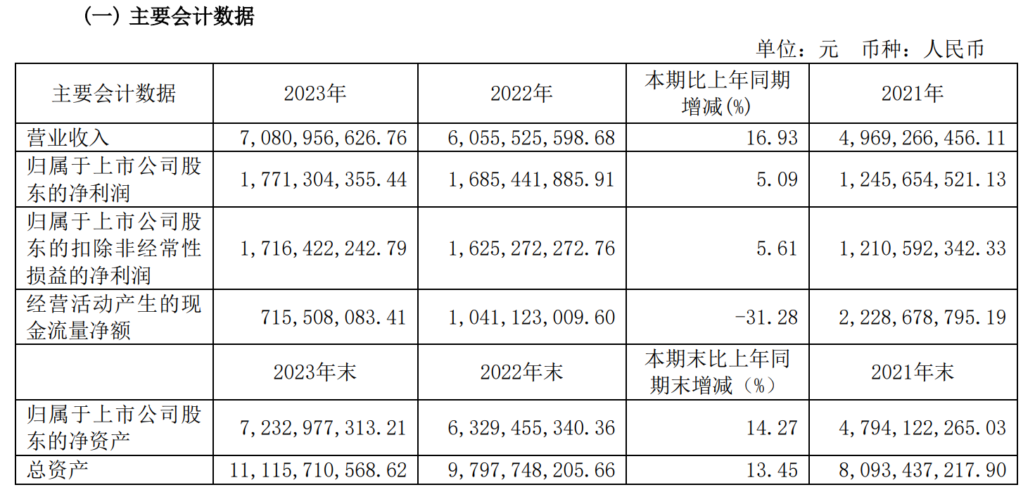 报告显示,2023年舍得酒业实现营业收入70.81亿元,同比增长16.93%;实现归母净利润17.71亿元,同比增长5.09%;实现扣非净利润17.16亿元,同比增长5.61%。基本每股收益5.345元,同比增长4.82%。