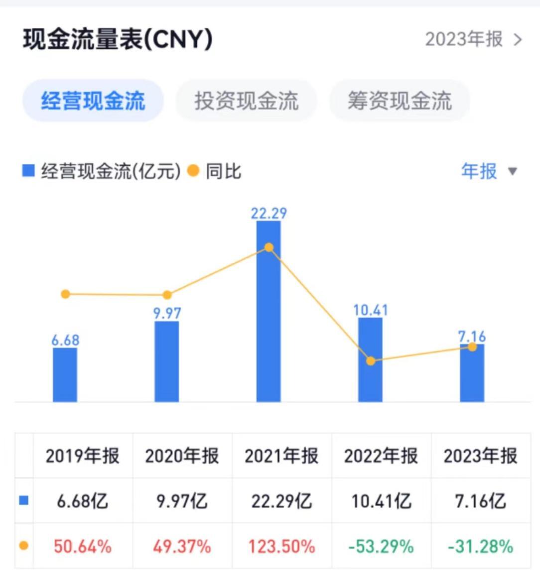 而数据显示,2019年至2023年,舍得酒业经营现金流分别为6.68亿元、9.97亿元、22.29亿元、10.41亿元、7.16亿元。