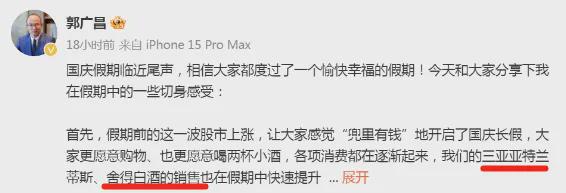 言语中,老郭特别强调了他的文旅、白酒板块,在假期消费上表现不错。