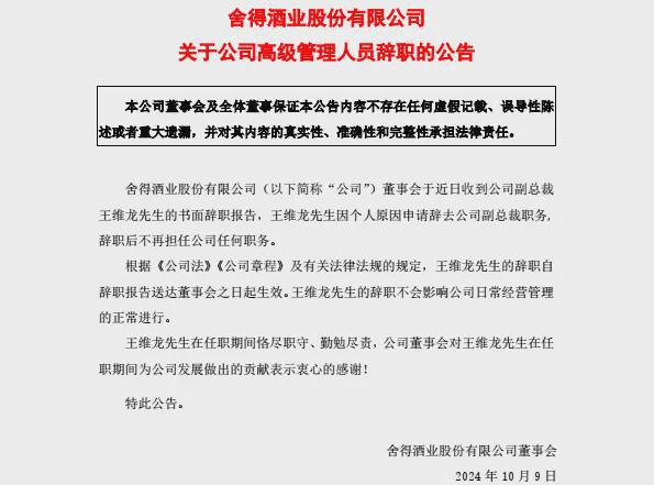 但没想到,舍得酒业收盘后却突发高管离职公告,令人颇有些猝不及防。据公告,舍得酒业副总裁王维龙系个人原因近日书面辞职且将离开公司。