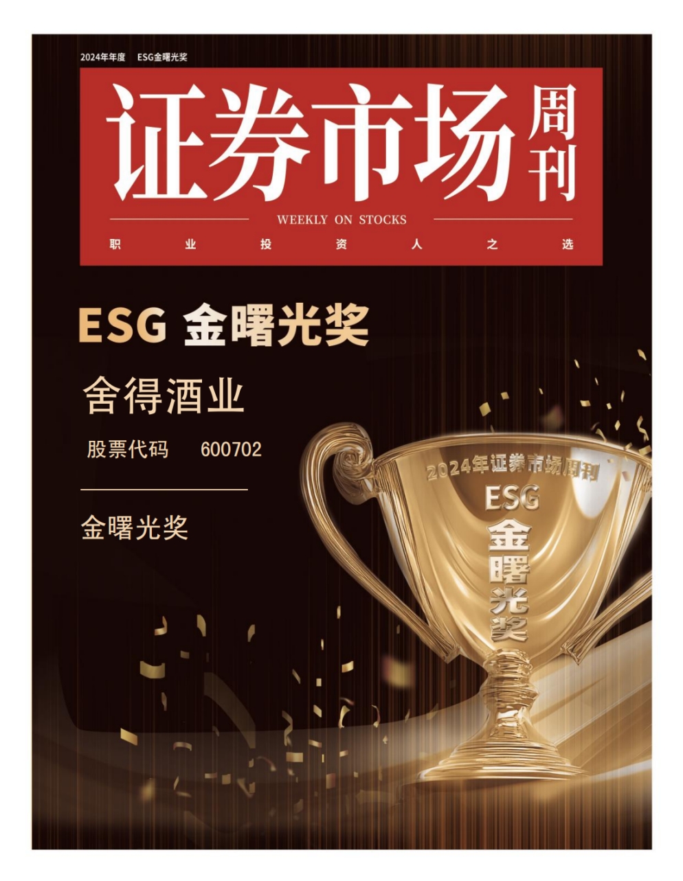 2024 年首届ESG金曙光榜单于11月23日揭晓。舍得酒业积极响应绿色发展号召,以生态酿酒理念精心雕琢出一片绿色产业的范本,荣获ESG金曙光奖。此项奖彰显了市场各界对舍得酒业在ESG领域的贡献给予高度评价。