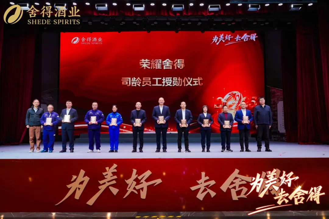 舍得酒业为连续司龄25年以上的10名功勋员工代表授予了“荣耀舍得”勋章,以表彰他们数十年如一日的坚守与奉献,激励员工坚定践行长期主义,弘扬与传承匠心精神。