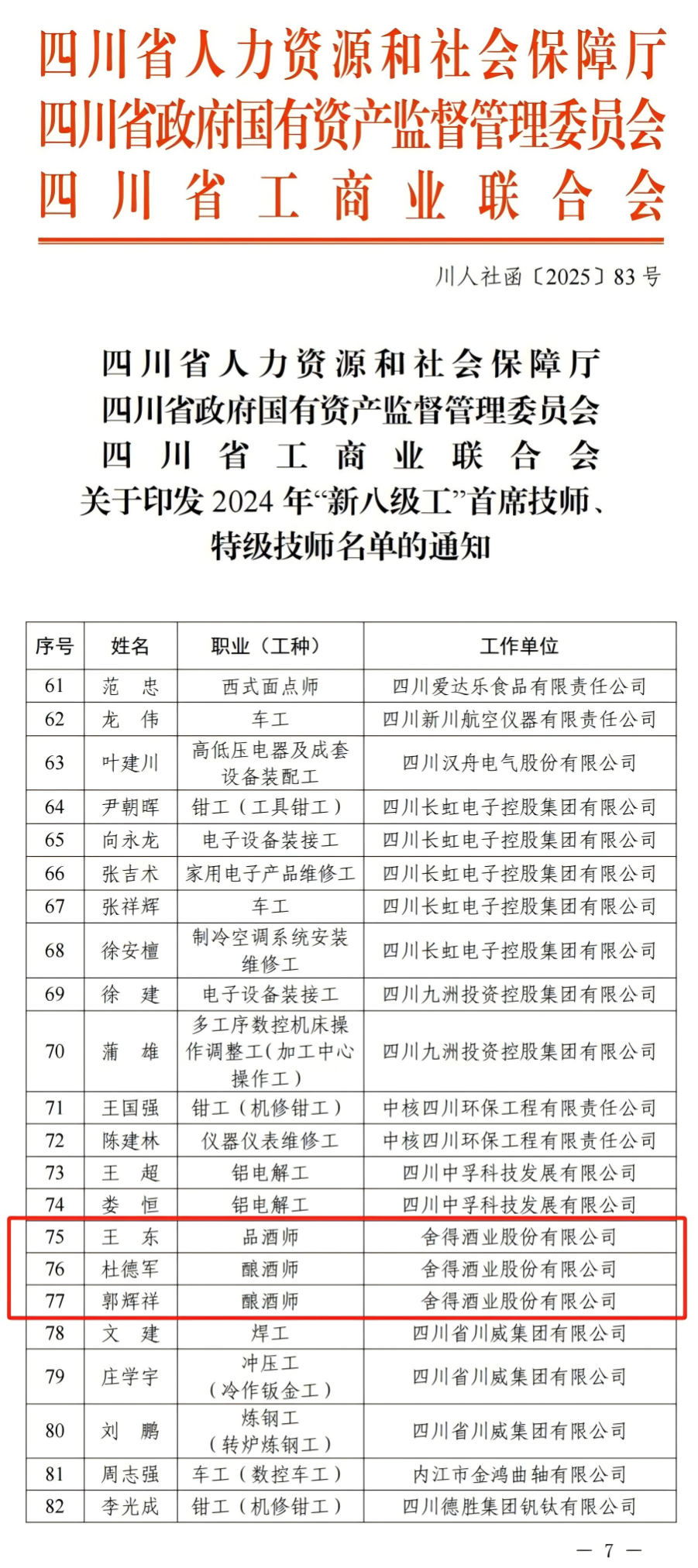 近日,四川省人力资源和社会保障厅、省政府国有资产监督管理委员会及省工商业联合会联合发布《关于印发2024年“新八级工”首席技师、特级技师名单的通知》(川人社函〔2025〕83号)。经严格评审与公示,舍得酒业员工王东、杜德军、郭辉祥3人凭借扎实的专业技能,荣登“特级技师”榜单(本次全省酒类行业荣登特级技师榜单仅15人)。