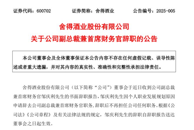 2月28日下午,舍得酒业(600702.SH)发布公告称,公司副总裁兼首席财务官邹庆利辞职,辞职后不再担任公司任何职务。对于辞职的原因,舍得酒业仅在公告中表示“邹庆利因个人职业发展规划原因”。