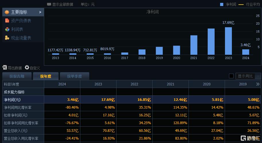 舍得酒业公告,2024年度公司实现营业收入为53.57亿元,同比减少24.41%;归母净利润为3.46亿元,同比减少80.46%。