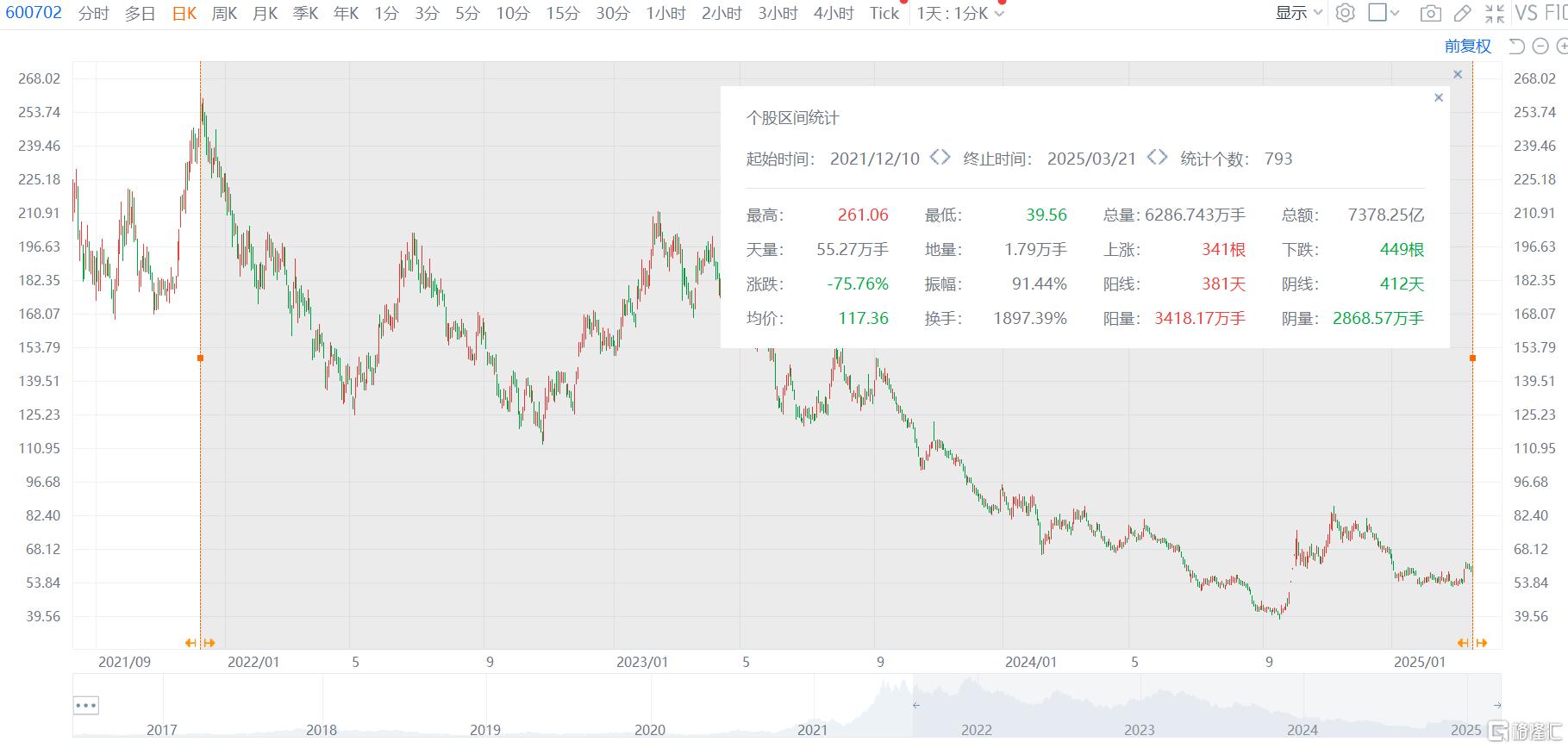 如果进一步拉长时间来看,舍得酒业当前的股价已较2021年12月高点累计下跌75.76%,堪称“膝盖斩”。