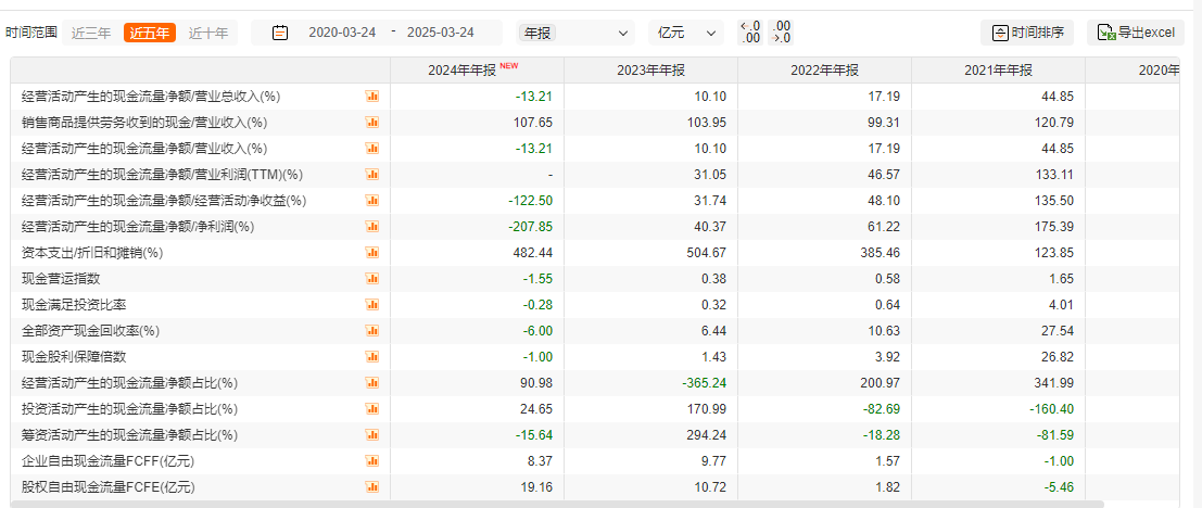 长期视角下,近三年以来的经营现金流增速也不是很好,下滑趋势很明显。据Choice,经营活动现金流与营收收入的比值一直在下滑。2024年,该数据为-13.21%。