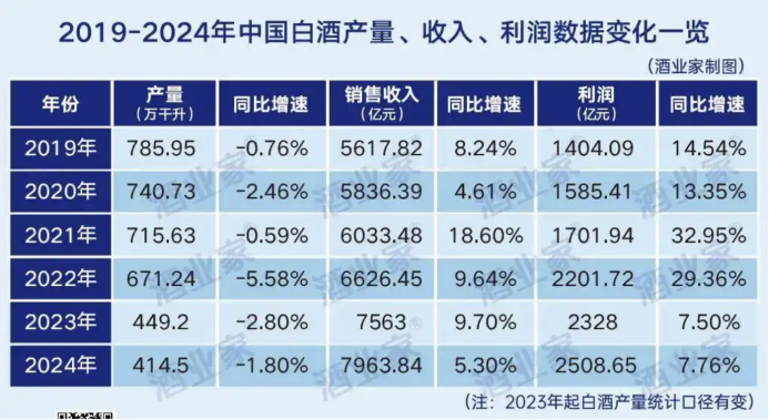 根据行业媒体酒业家公布的数据,2024年我国白酒行业销售收入为7963.84亿元,同比增长5.3%;白酒行业利润为2508.65亿元,同比增长7.76%。两个数据都还在增长中。