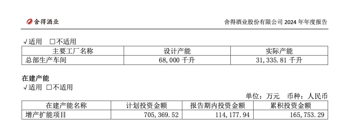 而根据财报数据,舍得酒业2024年总部生产车间设计产能为6.8万千升,实际产能只用了不到一半……